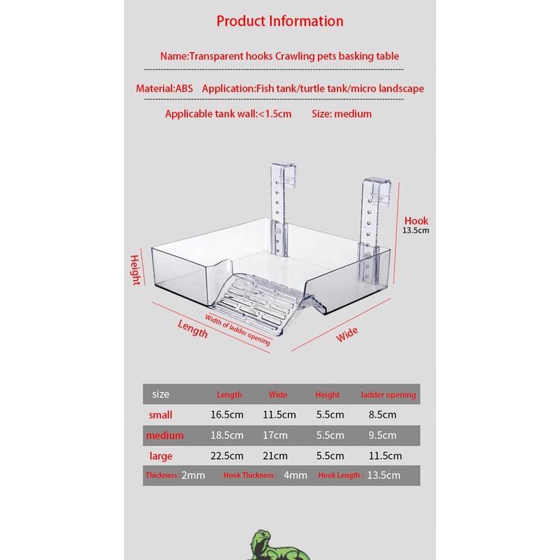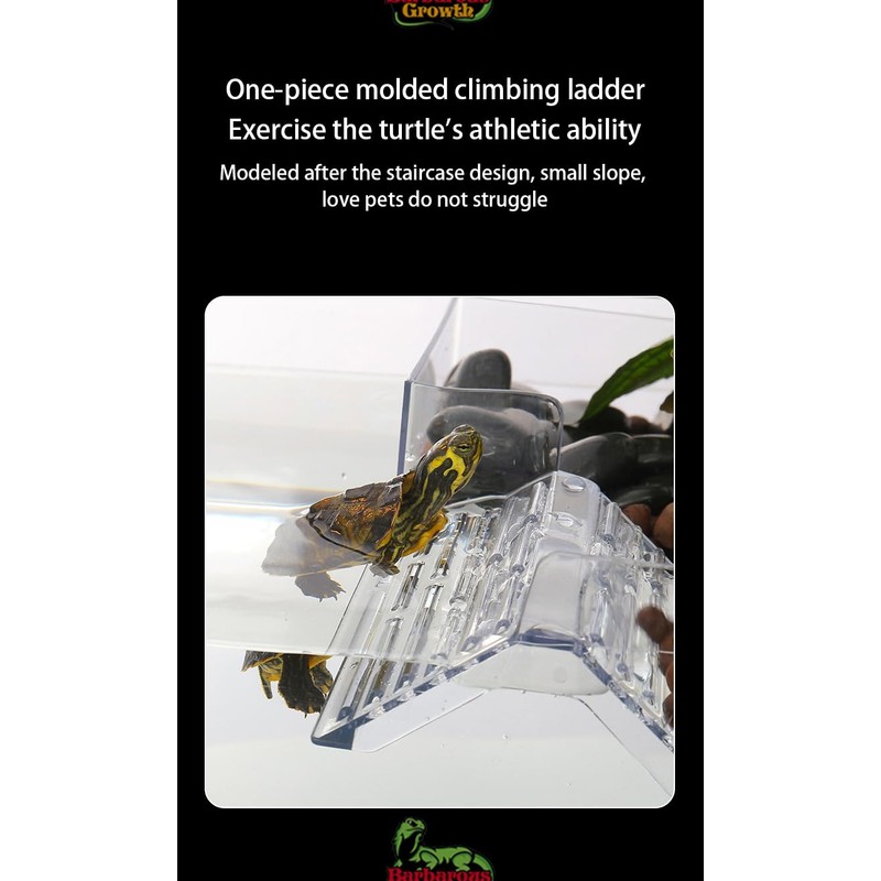 - Floating sun platform: material: acrylic, firm and not fragile. Sun bed size: 15 x 22 cm/5.9 x 8.6 inches, suitable for tank size: longer than 24 cm/9.45 inch, wider than 21 cm/8.26 inch. The simulated aquatic plant increases the friction between the turtle and the climbing ladder, so that the turtle can climb more easily.
