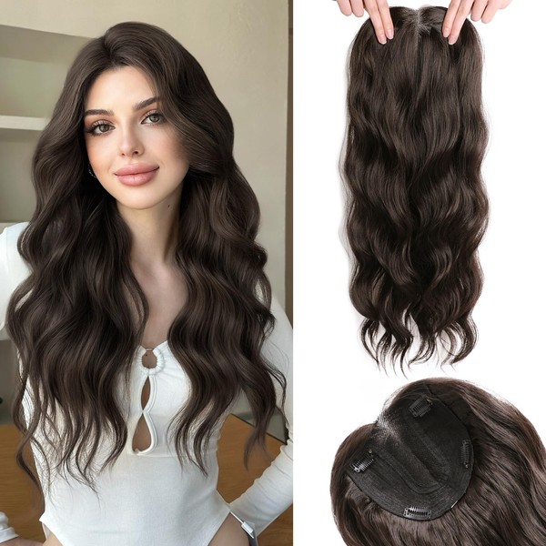 XIXISNOW Hair Topper 24 Inch Long Wavy Toppers Hair Pieces for Women Thinning Hairs Lace Hand-Tied Hairline Synthetic Heat Resistant Clip in Hairpieces 6"x6"Large Base for Daily Use Dark Brown