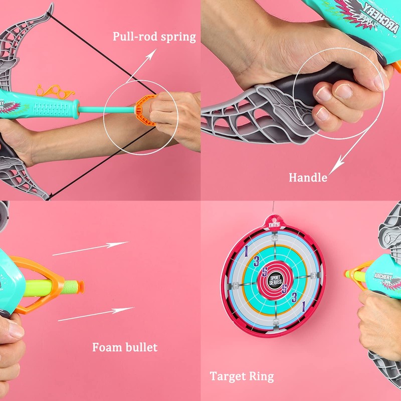 - New toy: Our children's bow and arrow toy is equipped with 5 foam suction cup arrows, 1 bow and arrow and 1 target, creating a perfect starter set. The bow gets a stylish new look and a powerful non-slip grip so you can release and shoot faster.
