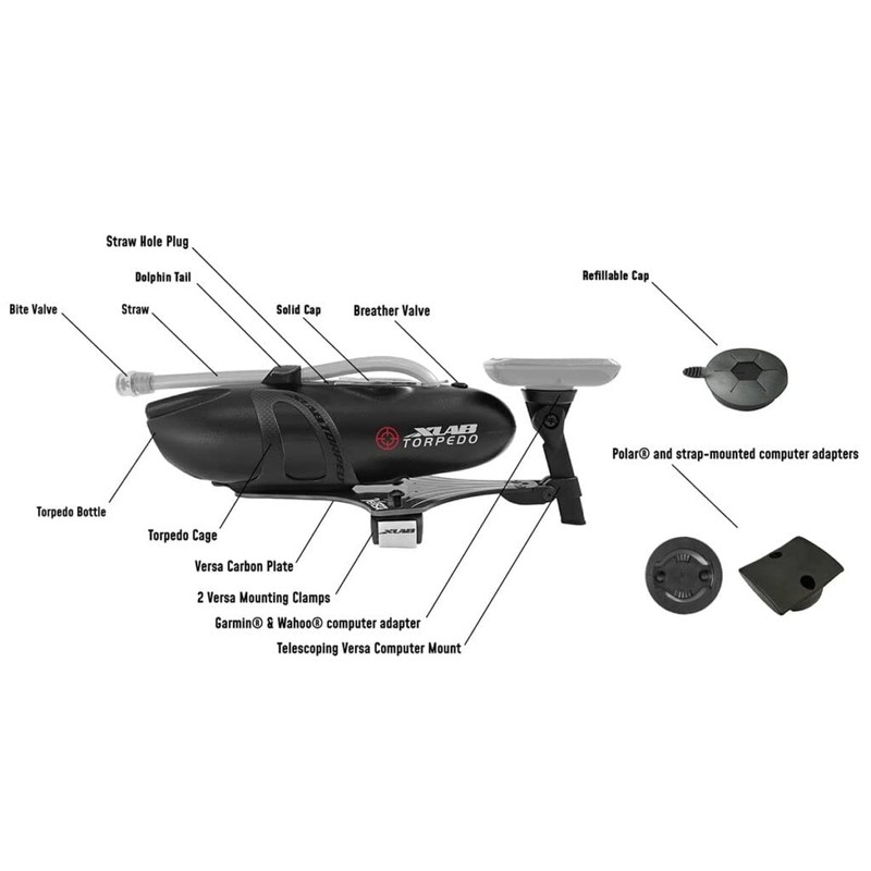 - Includes - 769 mL (26 oz) capacity high density polyethylene, Food Grade BPA-Free Torpedo Bottle, silicone Torpedo Straw with bite valve, Solid Cap, Refillable Cap, 16 layer unidirectional carbon fiber Versa Plate, Telescoping Garmin and Wahoo compatible Versa Computer Mount, and carbon fiber Torpedo Cage with 6 pounds of grip.