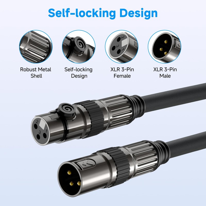 - Self-Locking Design: Our XLR male to female microphone cable design with a self-locking connector that easy to plug and pull out,The self-locking design is not only provides a stable connection but also prevent accidental between devices disconnections