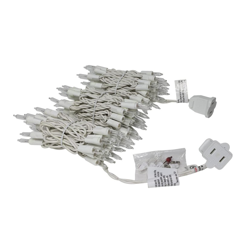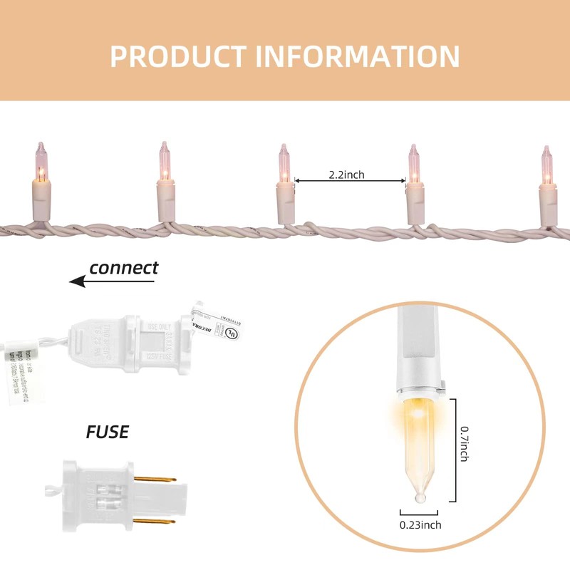- 19.6 Feet & End to End Connect: 12" Lead Wire, 3.25" End Connector,2.2” spacing between bulbs,Total 19.6ft with 100 mini clear bulbs.Connect up to 5 of these 100 count string lights end to end.