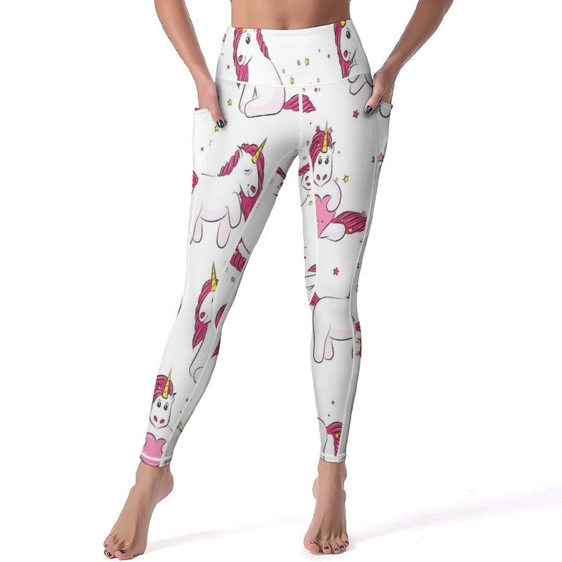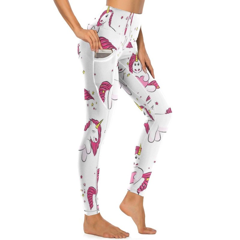 Xmkltbz Soft Stretchy Yoga Pants, Women High Waist Tummy Control Leggings Long Workout Athletic Tights with Pockets (2XL) Print Pink White Magical Unicorns with Yellow Stars Pink Heart on White
