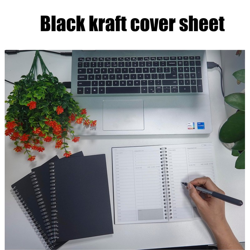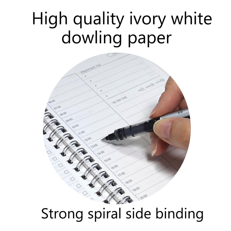 - This notebook features a strong spiral page binding, so it is a planner that lasts a long time and can lie at an angle of 180 degrees to make writing easy and efficient. So you can write on a notebook that is completely flat and even.