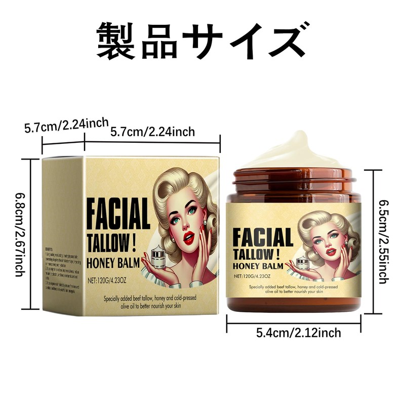 - 深くうるおい、肌にハリと潤いを:この保湿クリームは、乾燥した肌にたっぷりの水分を与えるように、特に秋冬やエアコンの効いた室内で過ごす時間の長い方にぴったりです。牛脂と蜂蜜の天然の組み合わせが肌の奥まで浸透し、水分を長時間キープ。肌はふっくらと柔らかくなり、突っ張り感や粉ふきの悩みも解消されます。毎日使うことで、肌は驚くほどスムーズに。肘や膝など、特に乾燥しやすい部分もなめらかに整います。