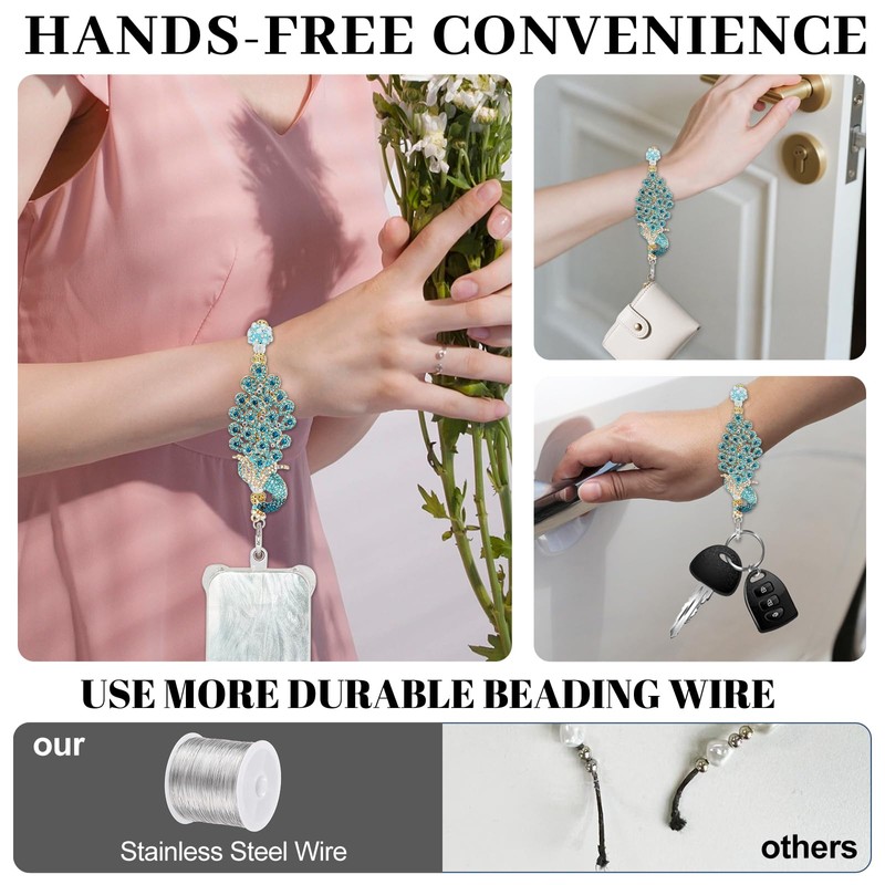 - Diamond Peacock Phone charms strap : Channeling the peacock's vivid allure, this phone wrist strap dazzles with a crystal-laden peacock focal point. Hand-threaded turquoise-shaded beads intermingle with gold-hued baubles, crafting a layered, eye-catching design. Artisans painstakingly secure each crystal and bead, merging artistry and sturdiness for a show-stopping phone accessory