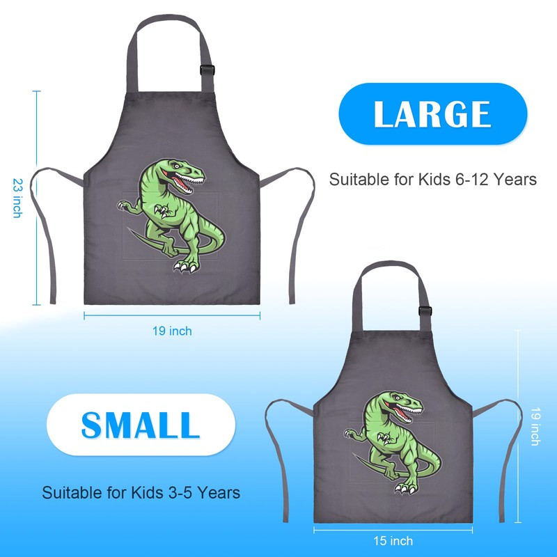 - Adapted children's size: the small size is recommended for children aged 3-5 years and the detail measurement is 15 x 19 inches. The large size is recommended for children aged 6-12 years and the detailed measurement is 19 x 23 inches. This apron that extends from chest to knee provides excellent coverage and protection from stains
