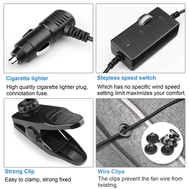 - Adjustable DesignWith a big speed controller, you can change wind speed easily and effortlessly according to your feeling. Stepless speed regulation which has no specific wind speed setting limit maximizes your comfort; Car fan provides cooling air circulation in any desired directions with 360 degree tilt rotation