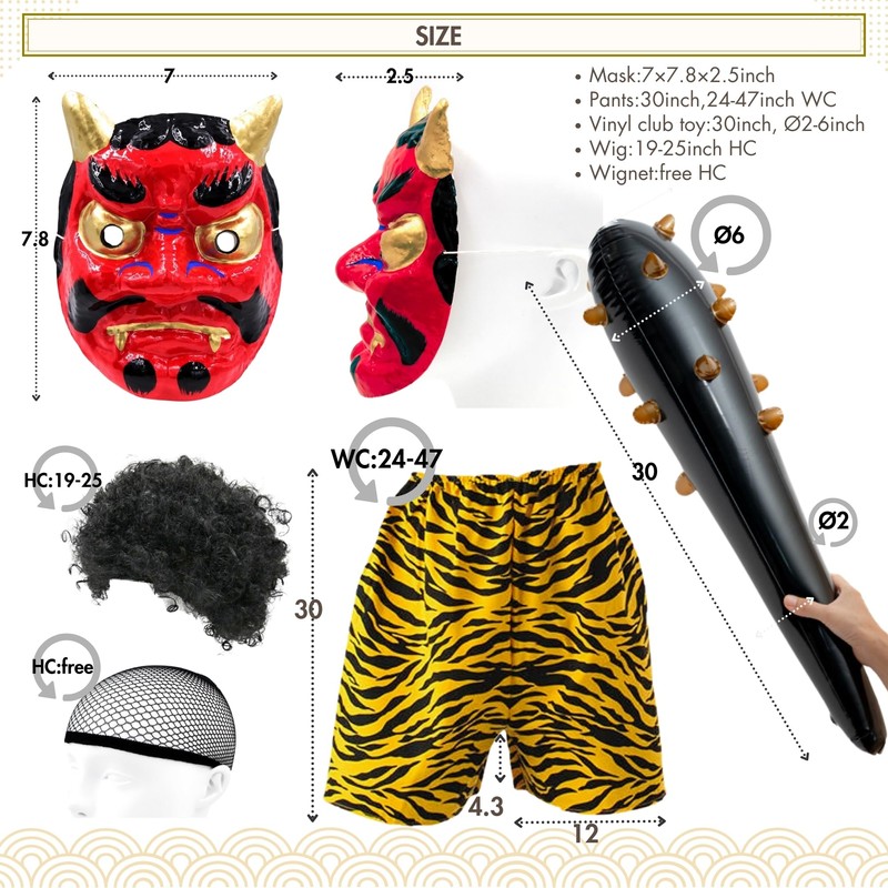 - (Approximate Sizes and Weights) Mask:7×9×2.5inch,2.5once Tiger pattern pants:30inch,23-46inch WC,3.8once Wig:23inch HC Wig net:free size vinyl club toy:30inchx Ø2-6inch