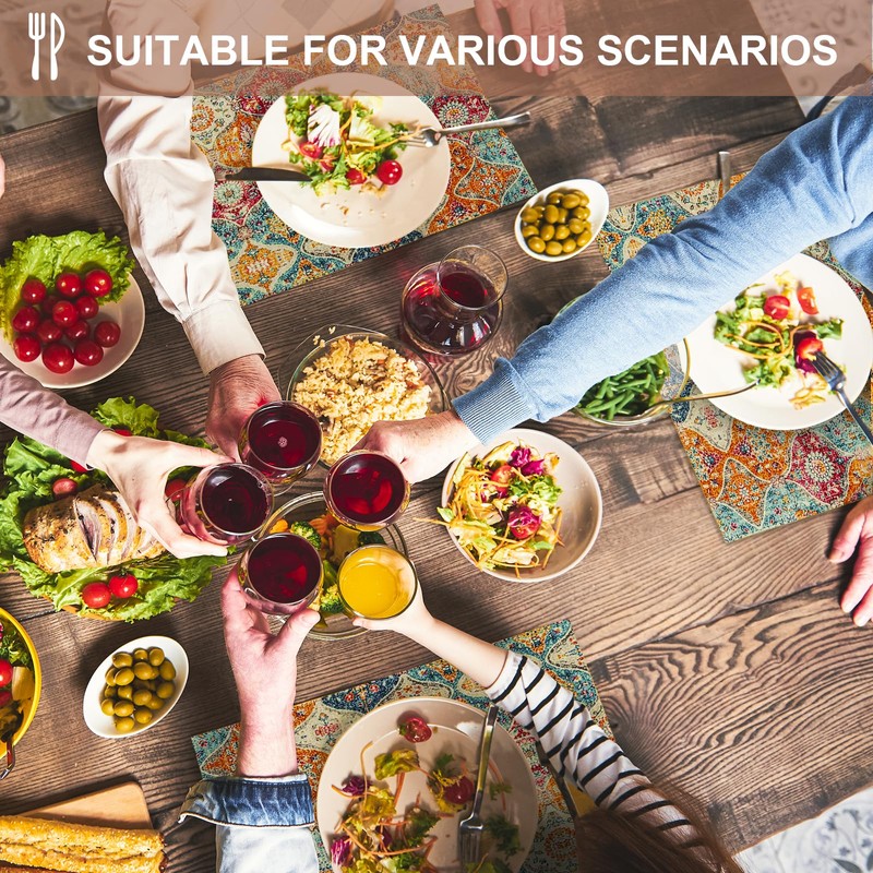 - Multifunctional Usage:The placement mats for dining table are suitable for daily dining indoors or outdoors, including Christmas, Thanksgiving, Easter dinners, birthday parties, cafes, restaurants, picnics, and camping, adding a unique touch of color to gatherings.