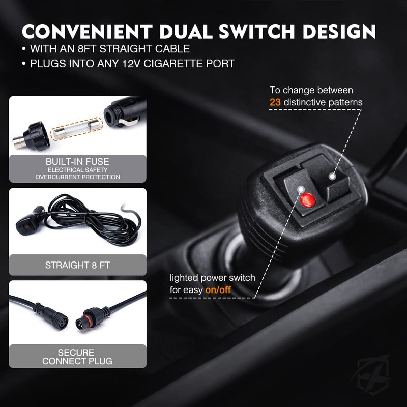 - CONVENIENT DUAL SWITCH DESIGN: Digital display with pattern selector or plugs cigarette lighter into any 12V cigarette port, easy change between 23 flashing patterns and turn on/off power. Including last pattern memory recall.