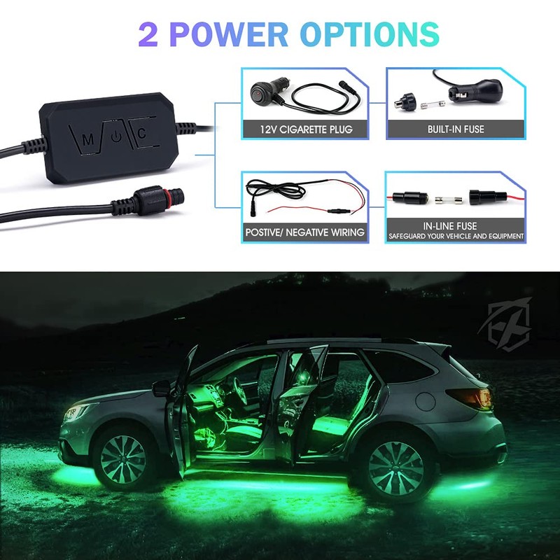 - [EASY INSTALLATION] - With Quick Connect Plugs and Pre-Applied Adhesive Tape to Apply the LED Strips under the car and interior seat/deck. Can be Used in a variety of Interior and Exterior applications including all cars, SUVs, JK, JL, vans, trucks, boats, pickup decorations, etc,