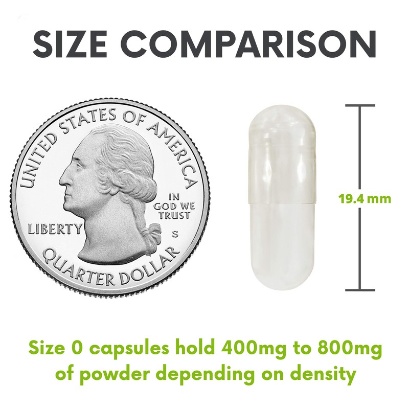 - Easy to Fill - Whether you like to manually fill your caps or use a capsule filling machine, our size 0 empty vegetarian capsules are designed with tough anti-break conisnap rounded ends and are transparent to make precise filling easier than ever. Our size 0 capsules hold 400mg to 800mg of powdered supplements depending on density.