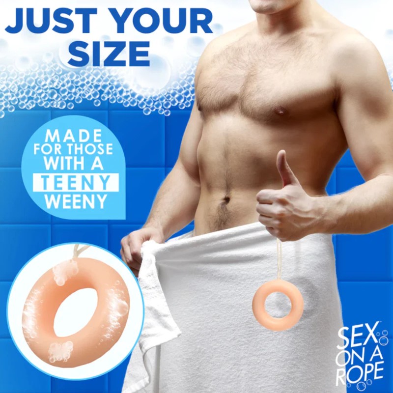 Keep It Clean and Playful with our C-Ring Shaped Gag Soap Ensure your weenie is not just clean but super cleany with our C-ring shaped soap — the perfect gag gift that adds a touch of humor to body care. Elevate your cleaning routine with these key features and benefits: Key Features: ---Great Gag Gift: Surprise friends with a dirty sense of humor by gifting them a soap that adds a playful twist to their cleaning routine. ---Lightly Scented: Enjoy a mild and fresh scent that won't offend even the most sensitive noses, making your cleaning experience delightful. ---Moisturizing: This soap won't leave your skin chapped or dry, providing a gentle and moisturizing cleanse for your weenie. ---Easy Storage: Hang it up between uses using the included nylon rope to prevent it from losing its shape, ensuring longevity and functionality. Make your weenie cleaning experience superb and sudsy by slipping this peach-colored soap over your shaft. Choose the large size for medium or large peckers, and keep it handy with the convenient nylon rope for easy storage and maintenance. This soap is not just a practical addition to your bathroom; it's also a conversation starter and a fantastic gift idea. Measurements: ---Inner Diameter: 1.5 inches ---Outer Diameter: 3 inches Materials: Rope: Nylon