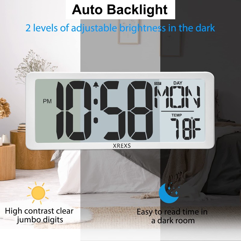 • EXTRA LARGE DISPLAY WITH AUTO BACKLIGHT ----- XREXS large digital wall clock has an extra large LCD high-definition display with big bold numbers, making this easy to see from far away. It's an extra large wall clock great for seniors and people with low vision. Built-in a light sensor, the clock offer 2 brightness levels backlight to meet your needs, which can be turned off if you don't want the extra light in the room.