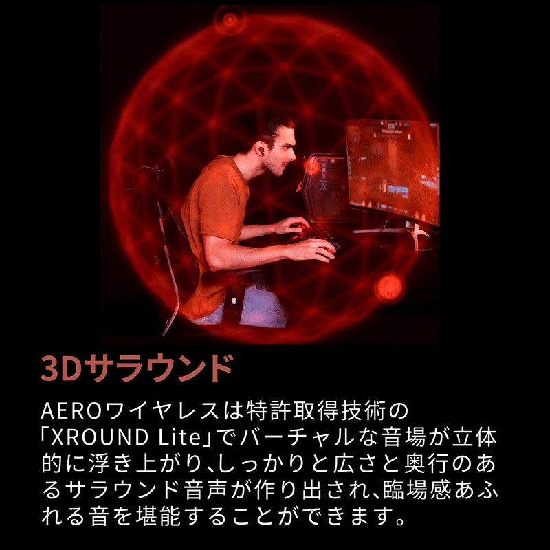 - ■ Low latency algorithm "XROUND Low Latency" with a unique chip firmware design that achieves 50ms low latency and provides an experience that is close to zero sound loss as possible. The exclusive XROUND Lite surround technology is incorporated into the AERO for immersive sound