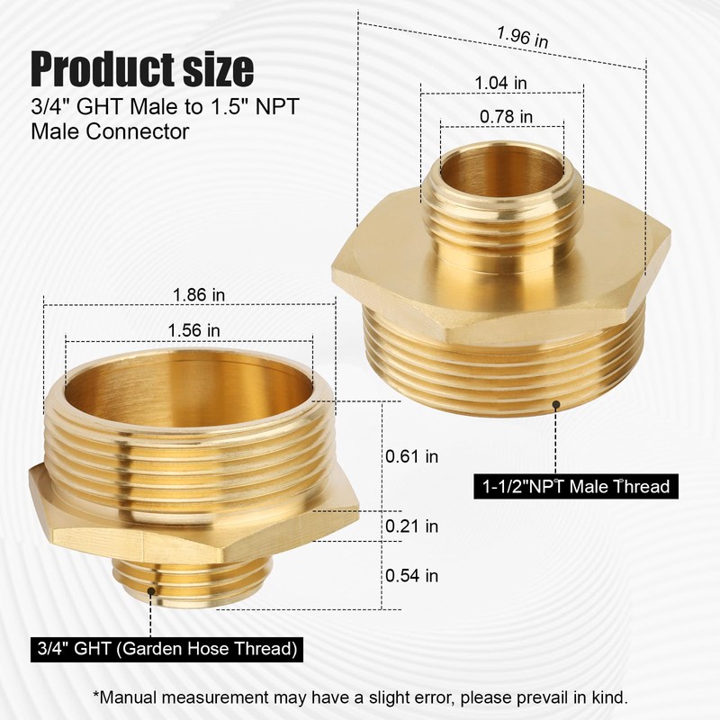 - Standard 3/4" male garden hose connector to 1.5" NPT male thread for connecting pipes, hoses or fittings with different end types and diameters