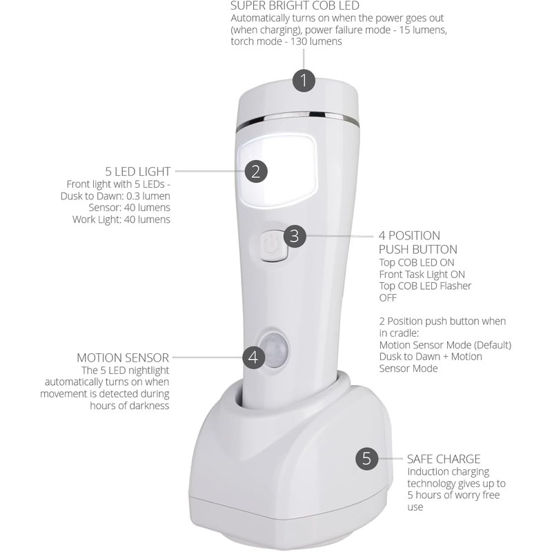 - Torch with single super bright COB LEDs - 130 Lumens (Torch Mode) 15 Lumens (Emergency Mode)