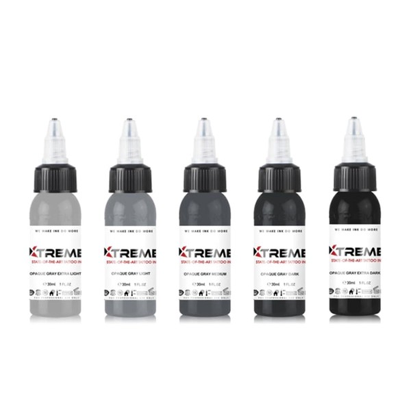 Xtreme Ink Opaque Gray Set: Elevate Tattoo Artistry with 5 Shades, Extra Light, Light, Medium, Dark, and Extra Dark, Acrylic-Free, Water-Based, Premium Inks for Grayscale Perfection (Set of 5, 1/2 oz)