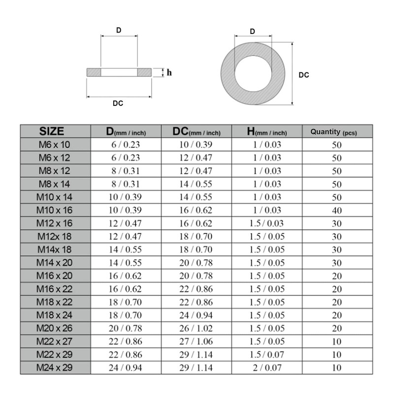 - Assortment of copper gaskets in various sizes. Our packaging includes M6, M8, M10, M12, M14, M16, M18, M20, M22, M24, thickness: 1mm, 1.5mm, 2mm, total 18 different sizes to meet your different daily needs.