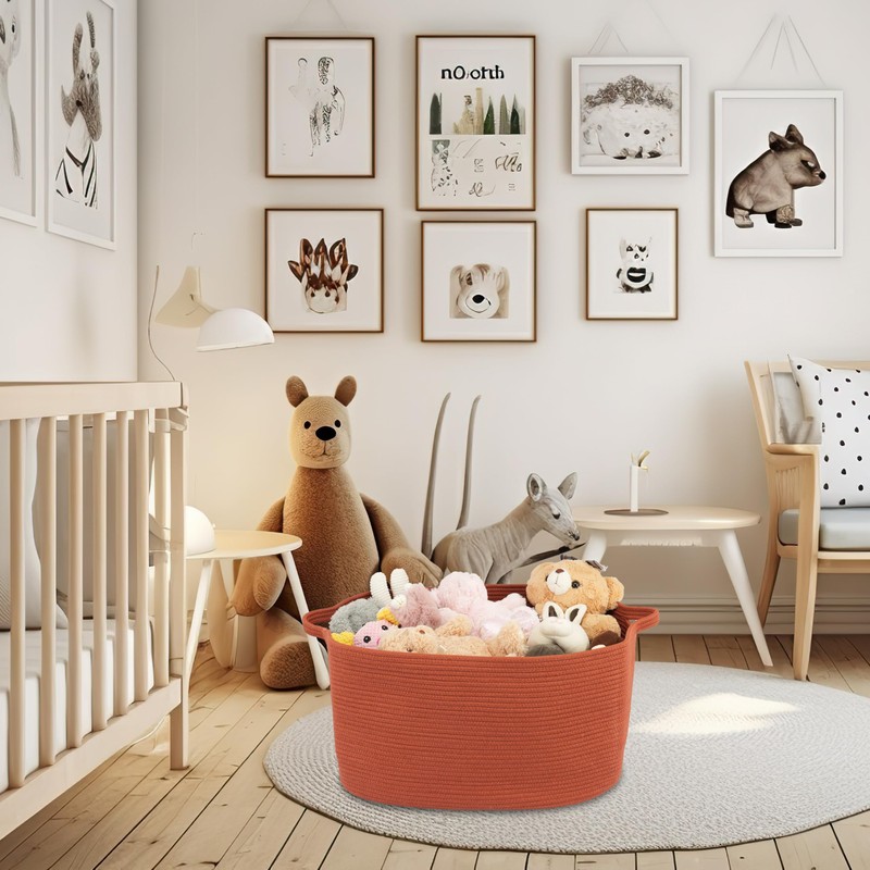 - Toy storage basket for kids with handles: This rope basket is features long and sturdy handles for easy mobility. this large rectangle rope basket is perfect for storing toys and doubles as a pet toy basket, suitable for dog toy storage. It also serves as a convenient toy basket for kids or baby nursery basket. Crafted from soft cotton rope, the cloth basket ensures safety with no sharp edges, preventing scratches on your furniture or floors.