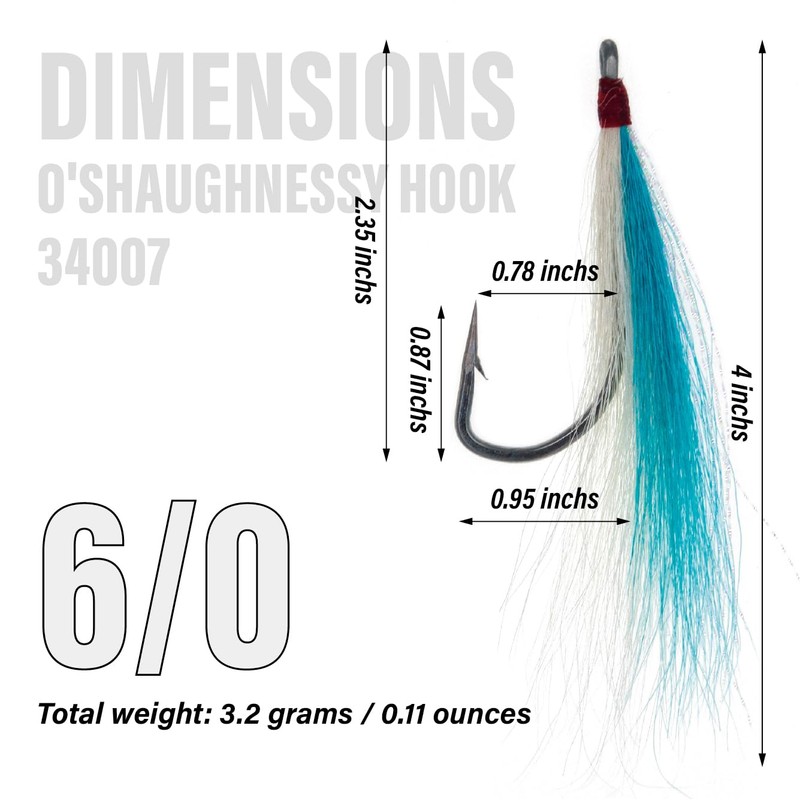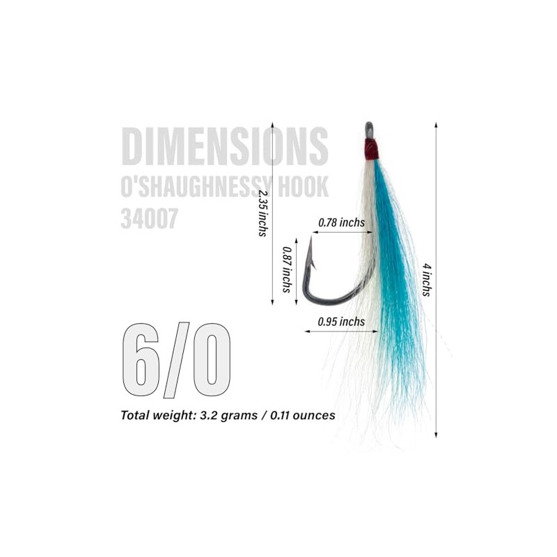 - PREMIUM CONSTRUCTION: The model 34007 O' Shaughnessy hook type stainless steel fish hook is strong and sharp, with a long-haired Bucktail with Mylar hand-tied skirt
