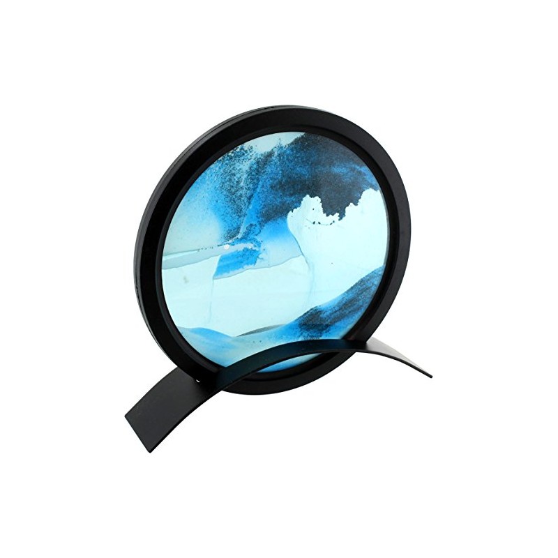 - Blue circle sand art creates mountain, ocean, valley and dune patterns as the sand trickles down