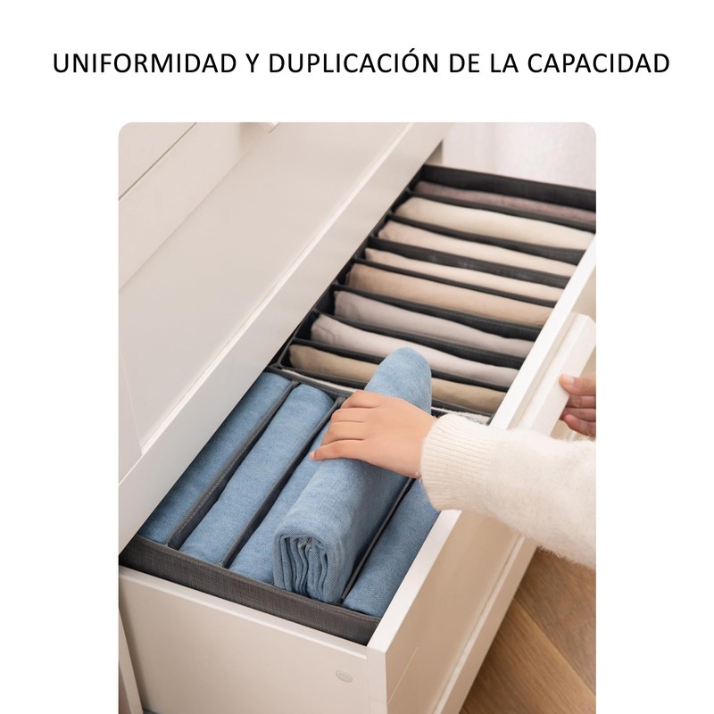 - 3 - The jeans storage containers for storing clothes can be easily placed in cabinets, drawers or shelves, so items can be effectively sorted into groups, facilitate access and keep the cabinet clean. In addition, the durable folding material and washing material can be stacked to double the storage space in your closet.