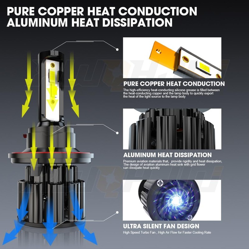 - Up To 60,000 Hours Lifespan - 9008 light bulbs comes with cold pressed aluminum heat sink and 12,000rmp cooling fan, it provides a high efficient and reliable cooling system, extend lamp life.