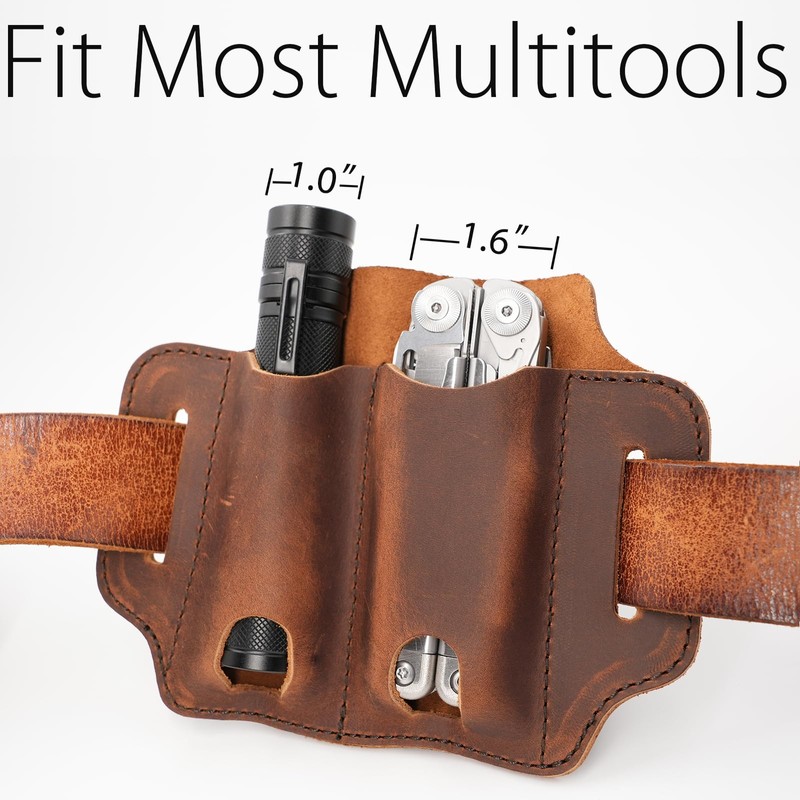 - DESIGNED FOR MULTITOOL & TACTICAL FLASHLIGHT - Size XXL, the leather belt sheath is designed for Leatherman SOG Gerber multitools, and most 5 inch knives. Fits most Olight Streamlight flashlights with 1.0" diameter.