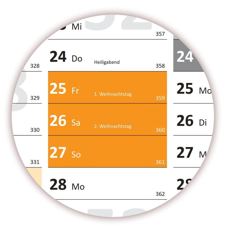 - The calendar contains the calendar weeks, continuous day counting, the dates for the time change and the beginning of the seasons. The legend also lists the moon phases.