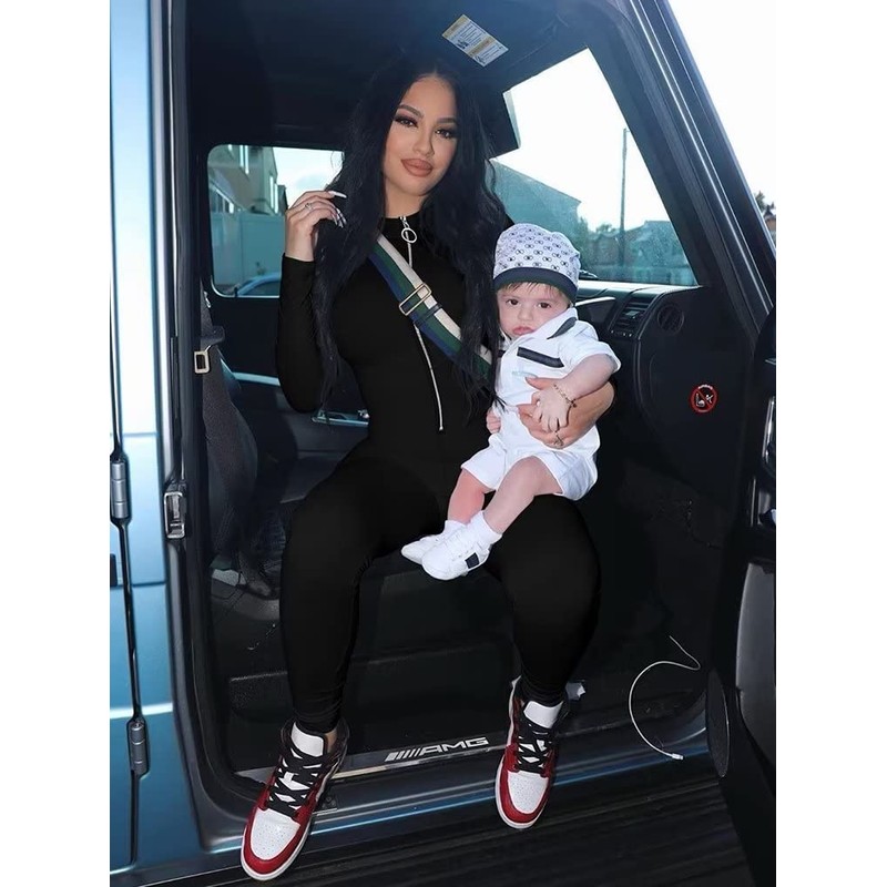 XXTAXN Women's Sexy Bodycon Long Sleeve V Neck Zipper Jumpsuit Rompers Black