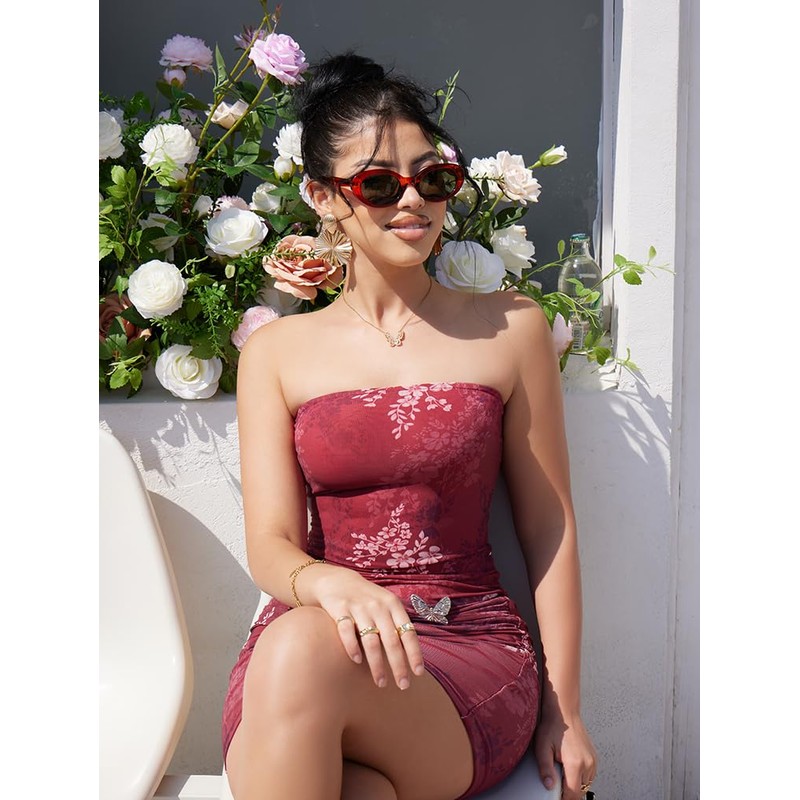 - Trendy Designs: The tube design excudes confidence and glamor, while the cut for a slim fit and ruched details with butterfly ornament accentuate women's curves, creating a flattering silhouette. The exquisite floral print detailing adds a touch of femininity and playfulness, bringing a romantic element to the sexy design. The mini length complements the overall sexy vibe of the dress