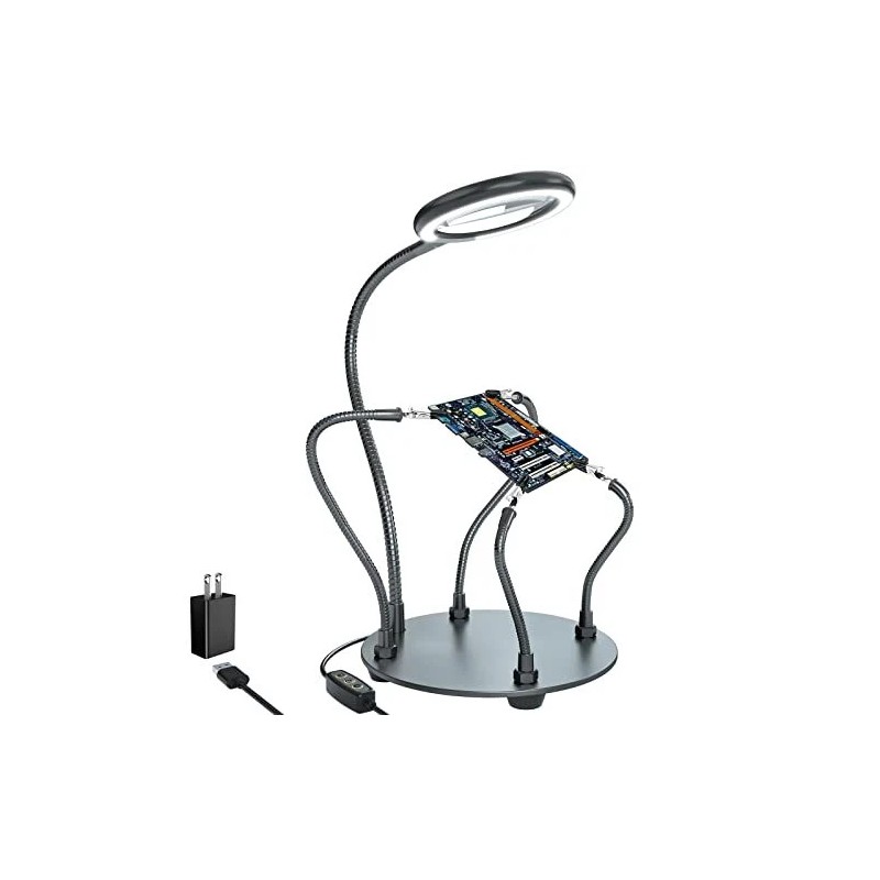 Helping hands soldering station with magnifying Lamp: soldering kit, very suitable for welding, assembly, maintenance, modeling, hobbies, jewelry, and crafts. With a sturdy and flexible metal hose arm and a dimmable magnifying glass, the circuit board can be fixed to the best position you want.