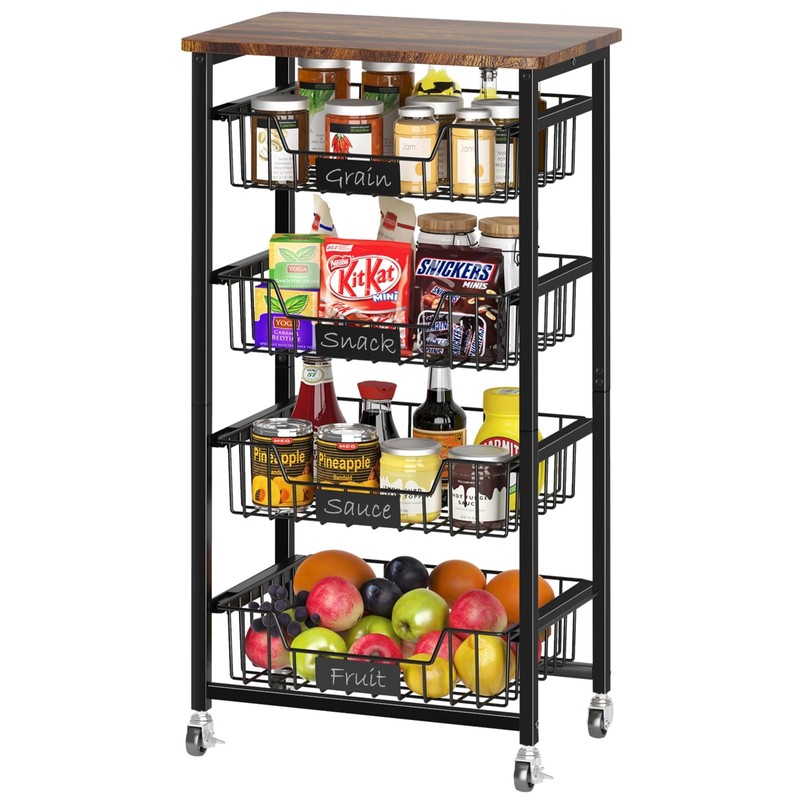 - 【Versatile Storage Cart】Featuring a wood-look top layer and four drawer baskets, this 5-tier kitchen cart on wheels can serve multiple purposes, and be utilized as a kitchen organizer, fruit and vegetable basket, produce basket, toy storage bins, can dispensers, toiletries holder, pet supplies cart, or an office supplies organizer.