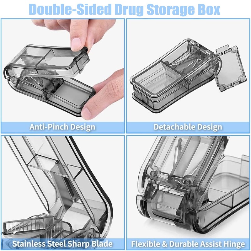 - đăExtra Pill Boxesă: Our pill cutter comes with two additional pill boxes that can store your pills and supplements before and after cutting, making it easy to stay organized. The keychain pill holder is Great Sealed, waterproof and portable. The multi shape pill cutter splitter can hold 4~8 pills.