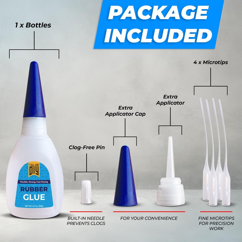 - EASY APPLICATION: Each bottle of Y'allCanDiy Rubber Glue comes with precision applicator tips for easy and precise dispensing. Our clear and flexible adhesive ensures neat and tidy repairs, making it ideal for both professional and DIY use.