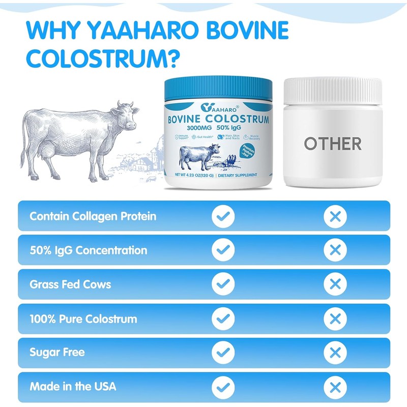 YAAHARO,Bovine Colostrum Powder 2500mg, Collagen peptides 500mg, 50% IgG Bovine Colostrum for Humans, Gut Health, Immune Support, Hair & Nail Growth 4.23OZ