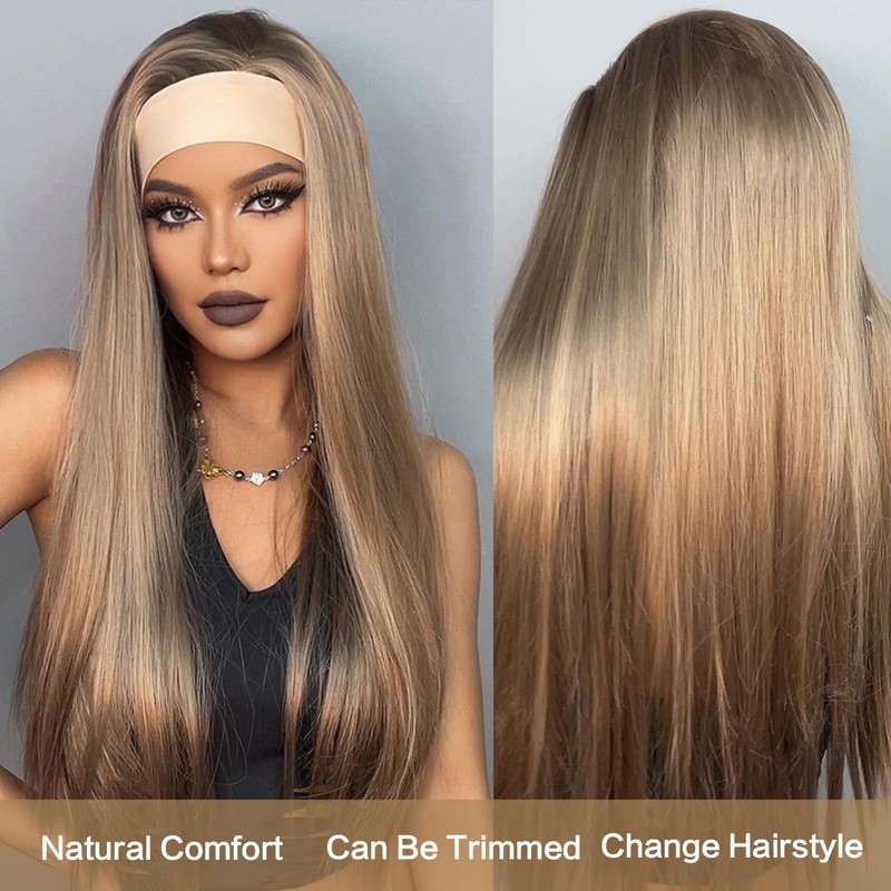 Yacurcur Headband Wigs Silky Straight Hair Glueless None Lace Front Synthetic Straight Hair Headband Wigs for Women 150% Density Light Brown Color 28 Inch