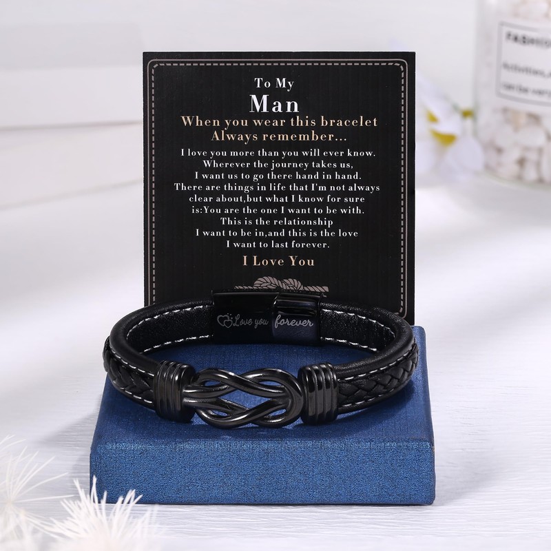 - 💖 Special Design: Mens leather bracelet has a simple design with black leather and an infinity knot for a stylish look. The men's bracelet is engraved with "Love you Forever" to convey the meaning of your love. This bracelet is sure to melt their hearts.