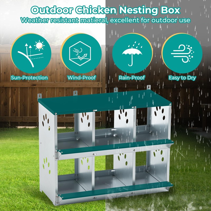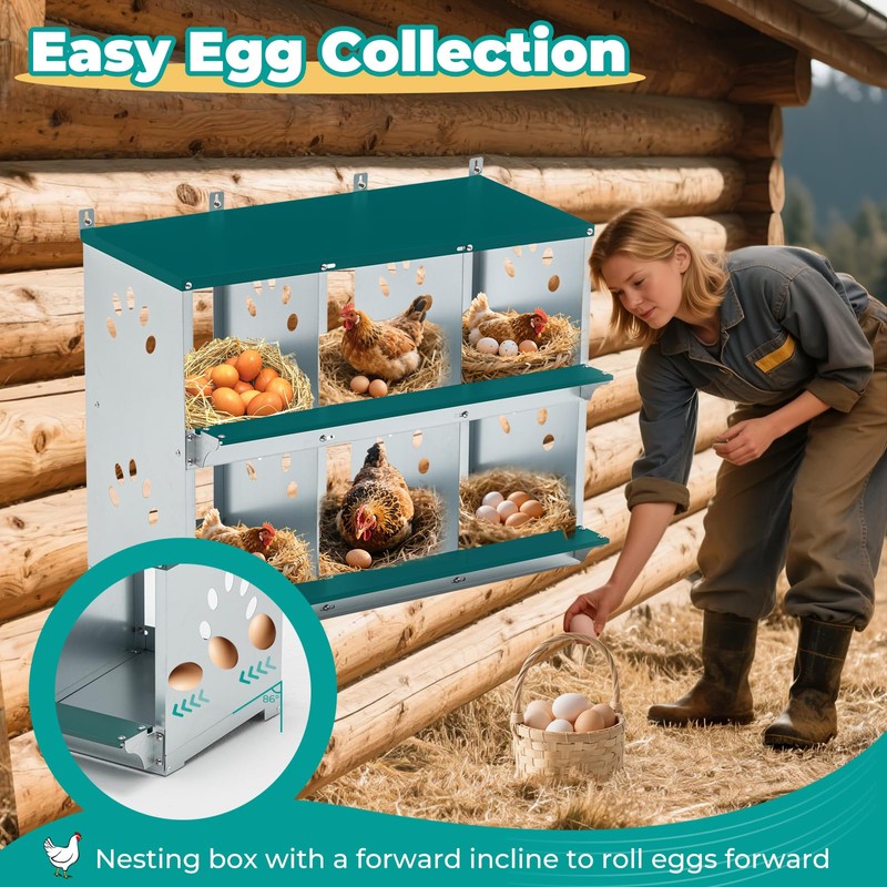 - 【Efficient Egg Collection】The nesting boxes for chickens features a sloped design, allowing eggs roll forward the front of nesting boxes, reducing broken eggs. Egg collection is quick and easy without reaching into the nest box. We suggest putting nesting pads into the nest box to further protect the eggs from collision