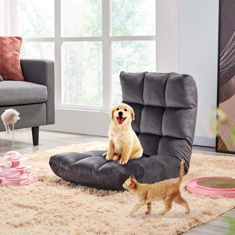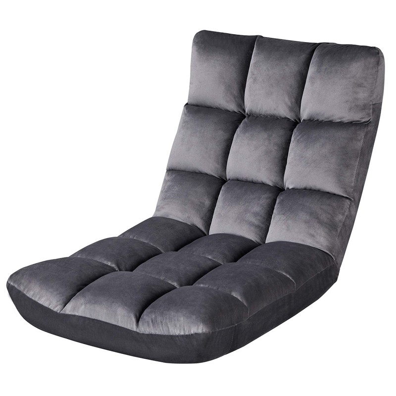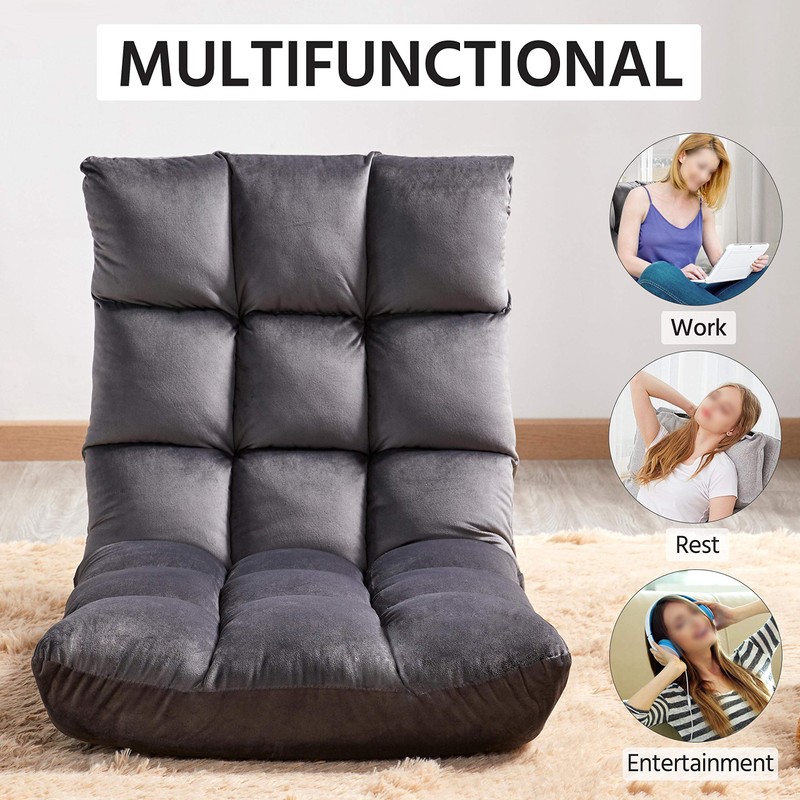 Floor Folding Gaming Sofa with 14 Adjustable Positions Portable Padded Lounge Chair with Backrest Lazy Sleeper Recliner for Single Adult Teenager Child Pet Quick Overview: With a folding floor sofa chair, you will have comfort and convenience with no compromise. The combination of clean lines and the soft flannelette surface creates a luxurious and inviting look. Crafted with premium iron, flannelette and high-density foam, this padded floor chair is sturdy and durable for long time use. There are 14 adjustable positions to meet your different needs and it will give you strong back support when sitting or reclining. The seat takes a compact size and well stuffed with thick foam for extra comfort. With the folding and lightweight design, it is easy to carry and store when not in use. Decorated with big biscuit tufting, it is great for apartments, dormitories, kids' rooms, game rooms, home office and anywhere else space is limited. Specifications: Materials: Flannelette, iron, foam, polyester Overall dimension(at the angle of 180 degrees): 111.5 x 53 x 14cm / 44 x 21 x 5.5in (LxWxH) Seat size: 53 x 48cm/21 x 19in (WxD) Maximum weight capacity: 90 kg / 198.4 lb G.W.: 6.3 kg / 13.9 lb Color: Gray Please allow ±1cm/0.5'' error due to manual measurement. **Package included:** 1 x Floor Sofa Chair