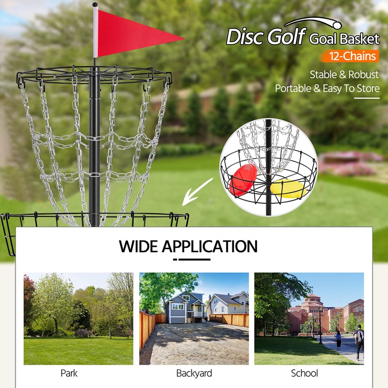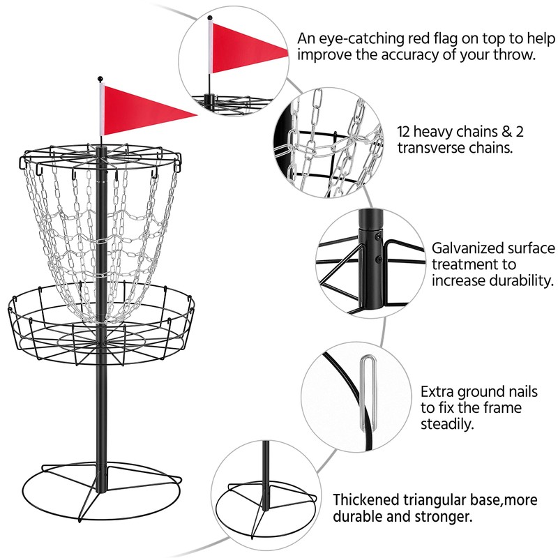 • Stable & Robust: This solid disc golf target is made for the ultimate catching experience, with 12 durable galvanized chains that won't disappoint you. The welded joints and reinforced base make sure you won't have any wobbling. We even threw in 3 ground stakes to ensure double the stability!