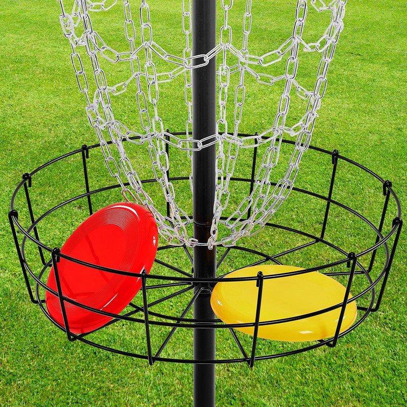 • Solid Construction: This disc golf basket is crafted with a powder-coated metal frame and heavy-duty galvanized chains to handle any type of weather and won't let you down during your outdoor disc adventures.