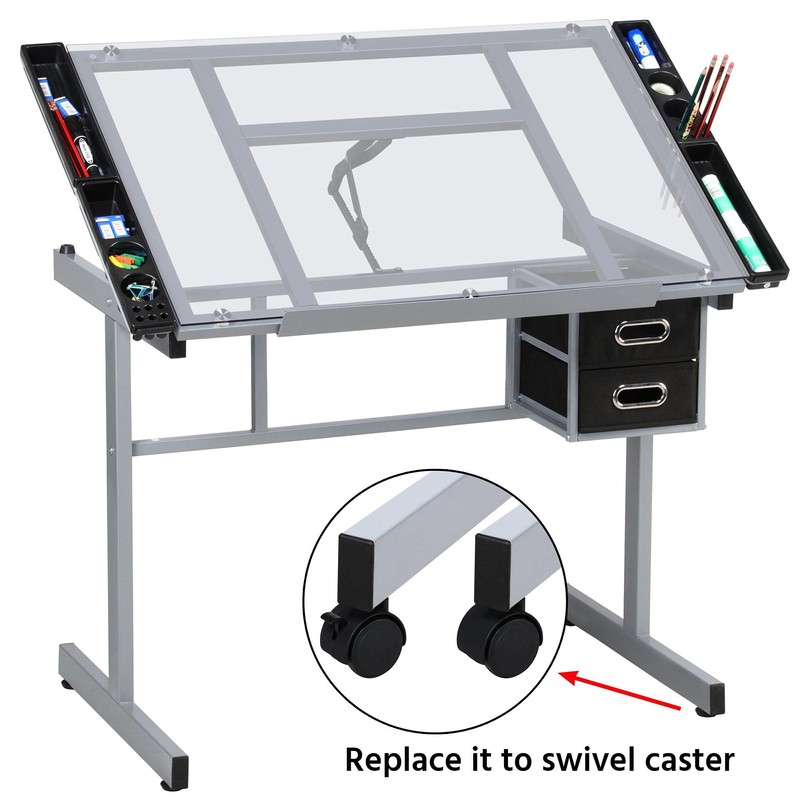 • Sturdy Table ConstructionConstructed of powder-coated steel frame and tempered glass desktop, this drafting table boasts strong wear resistance, good stability and high load capacity.