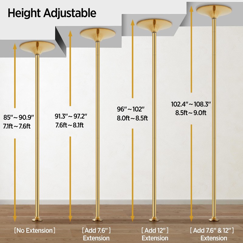 - Simple assembly: We provide illustrated assembly instructions and all necessary parts and hardware to help you set up the dance pole without difficulties. The bottom height adjustment method makes sure that the pole requires no ladder for the setup.