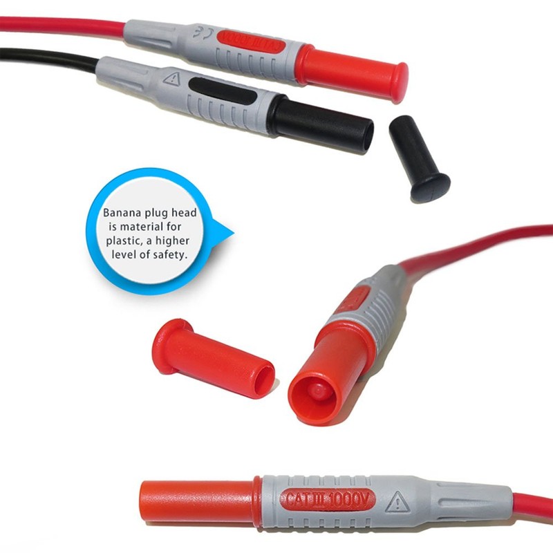 - Test leads (red, black) with safety shrouded, standard diameter banana plugs at both ends. Alligator clips with removable insulators can connect with 4mm banana plugs, maximum open width up to 10mm.