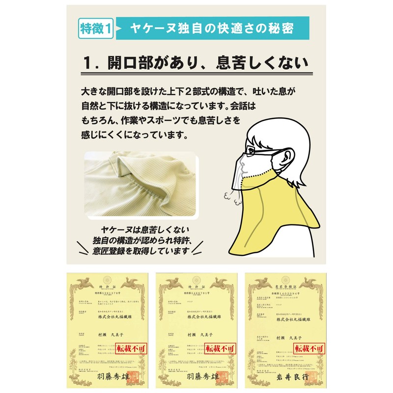 - The 2-part construction with an opening allows you to drink as it is without causing any discomfort. Of course, glasses won't fog. (Patent structure of Marufuku Textile Co., Ltd.)