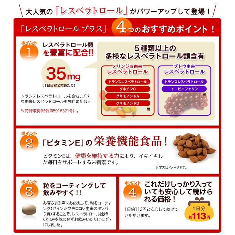 - (Includes more than 5 varieties of resveratrol types) The "resveratrol" is a type of polyphenol that is indispensable for plants. It is said to hold the key of French Paradox, which is widely found in grapeskin and seeds that are used as an ingredient of red wine. "Resveratrol Plus" is a tree native to Indonesia, and is formulated with resveratrol derived from Melingjo, known as the Tree of Life. Resveratrol derived from Melingjo has been known to stay in the body for a long time. In addition, to create a synergistic effect, we derive a unique formula, and added the resveratrol derived from grapes. With 2 tablets per day, you can get 35 mg of resveratrol varieties. Patented (Patent No. 5916321)