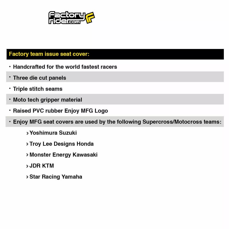 Enjoy Mfg Ribbed Gripper Seat cover Enjoy Mfg seat covers are an awesome up grade for your Quad Very easy to install and each cover is made to fit perfectly. Fits Yamaha Banshee Years :1987 - 2006 Enjoy Mfg gripper material Die Cut for an exact fit Double Stitched Seams Raised die cut gripper traction ribs Raised Pvc rubber Enjoy Mfg |